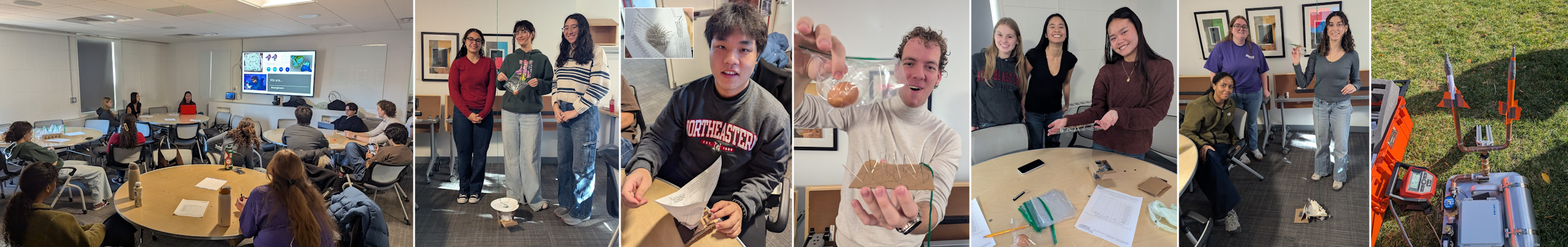 In lieu of a field trip on Friday, November 14th, we hosted a second volunteer training day of the semester. This time we partnered with Northeastern’s chapter of SWE (Society of Women Engineers) [NEU Link] – and so their volunteers had a chance to practice some of the activities we do with students: specifically reverse egg drop and paper rockets. STEM student Claire led Reverse Egg Drop presentation, SWE President Emily led us through the Wind Turbines presentation, and SWE Vice-President Ceci led us through the Paper Rockets presentation, and then our volunteers got to do a more advanced version of the activities (which are usually targeted towards 4th-8th grade students) -> using some of our least used materials. For the egg drop, we had two teams who had to use metal t-pins (very pointy metal parts) as part of their design (these have literally never been used before by students) -> shockingly, both of the eggs survived their falls into these designs. Another team had to primarily use chopsticks – and they very cleverly wove the chopsticks’ paper wrappers into a net. Interestingly, when we did the Paper Rockets activity, we also had two designs fail (which often happens with younger students) -> with the nosecone blowing off one design and the tiny rocket not working for another team. SWE will be coming to another field trip this Friday – and now they’re hopefully better prepared!